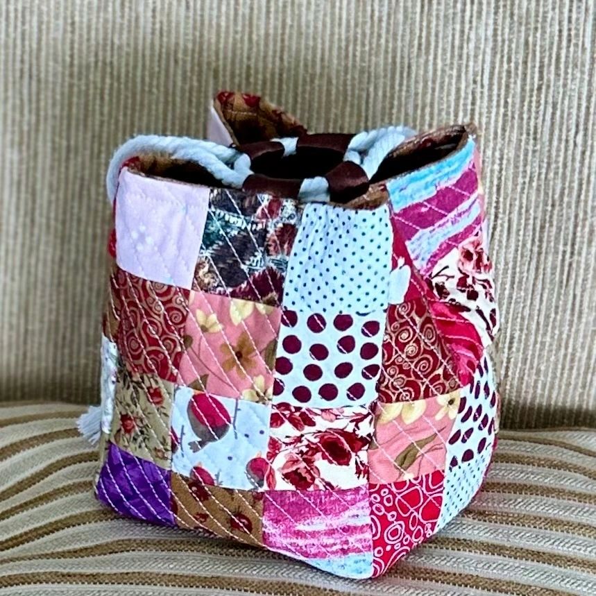 Quilted and lined, it is made from a carefully selected collection of my favourite fabrics in red, pink and brown hues.
